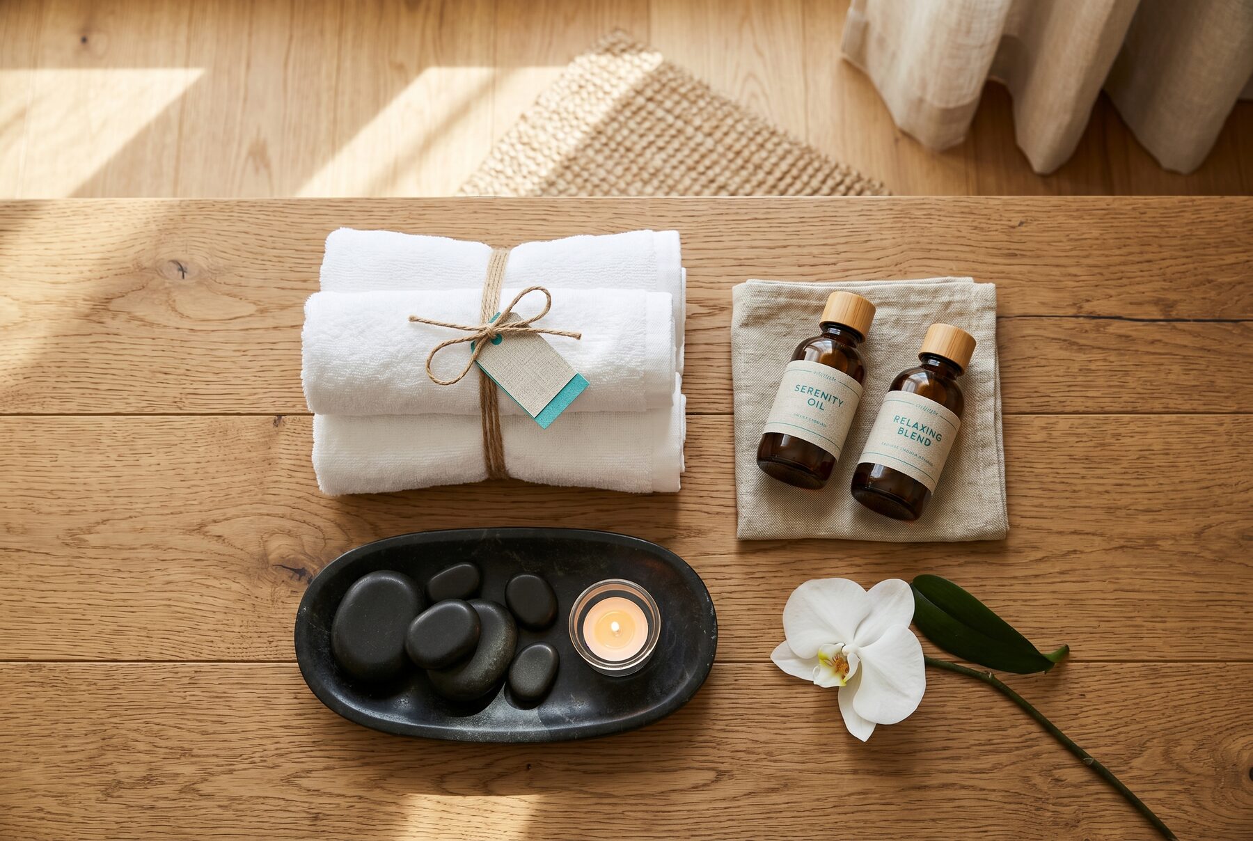 A licensed therapist arrives at your door with the table, the linens, the oils, and the quiet. You choose the room, the music, and the hour. Sixty unhurried minutes.